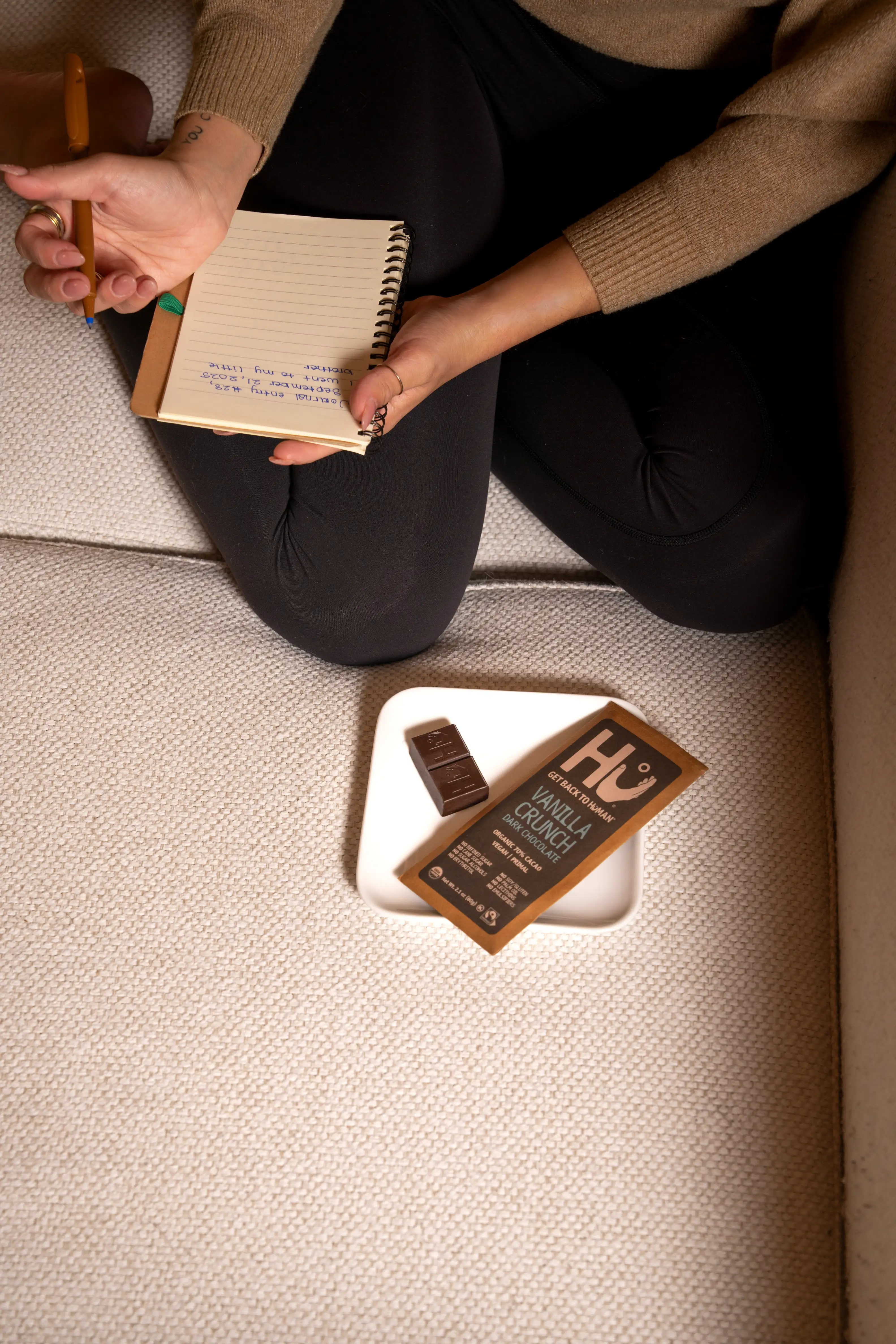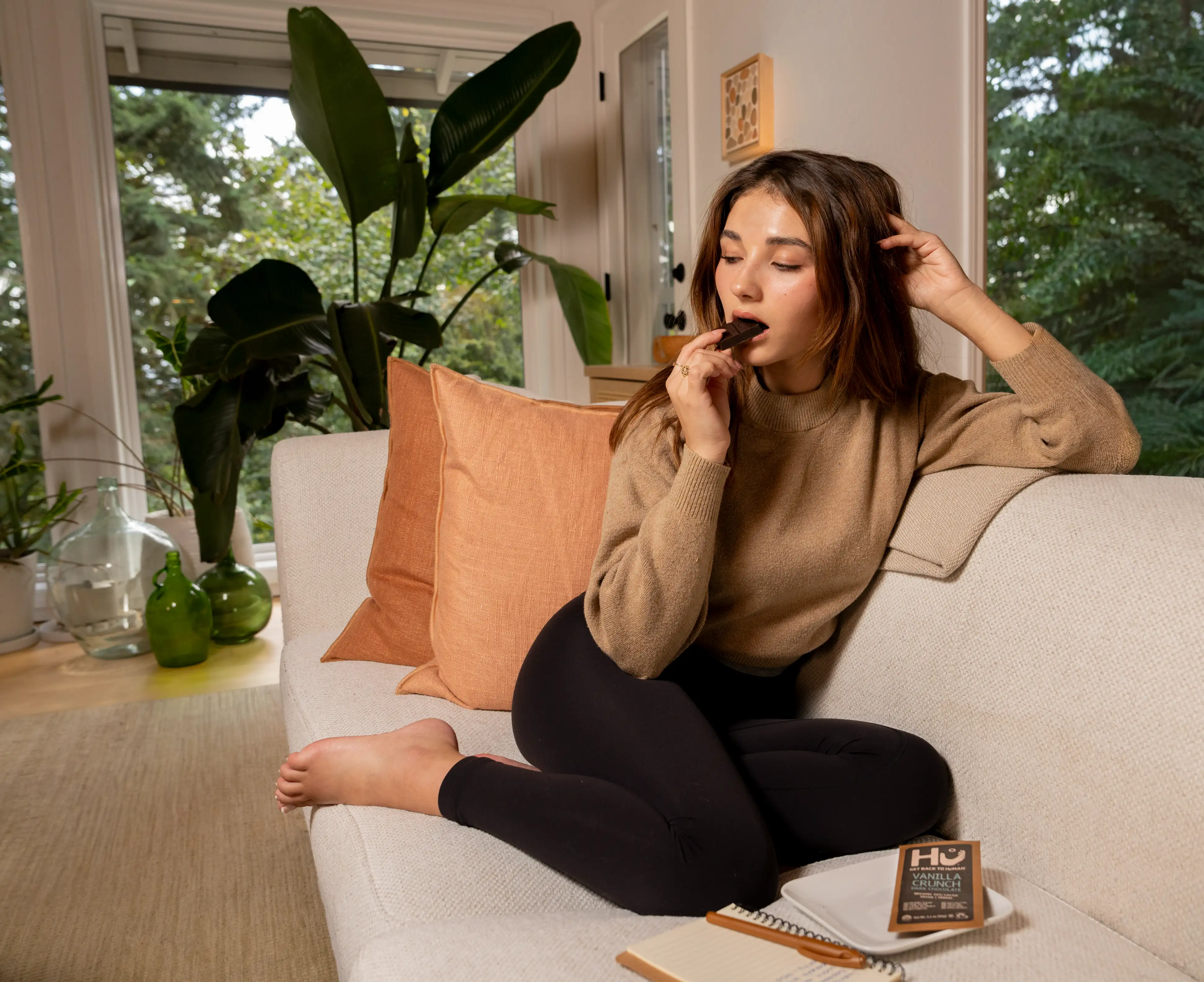 The shoot was built around everyday moments that naturally invited a small treat. Working from home, journaling, quiet breaks, and slow mornings served as the foundation. The focus remained on natural light, honest expressions, and subtle storytelling. Chocolate was shown as something enjoyed mindfully rather than overindulged. This approach allowed Hu’s clean ingredients and brand values to come through visually without distraction or over explanation.